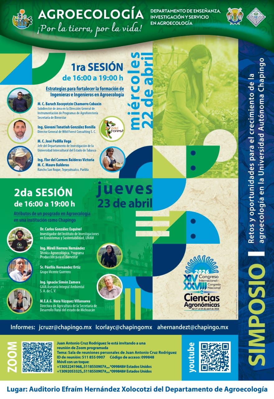 El jueves 23 de abril, en un horario de 16:00 a 19:00 h, se realizará la segunda sesión del Simposio: Retos y oportunidades para el crecimiento de la agroecología en la Universidad Autónoma Chapingo. Dicha sesión se titula: “Atributos de un posgrado en Agroecología en una institución como Chapingo”. Tendremos la participación de personas que pertenecen a distintos sectores (académico, publico, social y privado), a quien les solicitamos nos compartan su visión sobre los elementos formativos que debe tener un posgrado en agroecología. Además, será de gran relevancia contar con la opinión de personas como ustedes dada su gran experiencia en este ámbito.